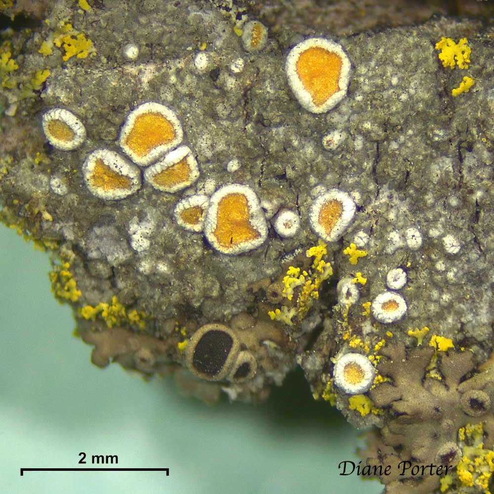 I've never seen this lichen before, with eggyolk-yellow apothecia bordered with white rims. No thallus, or just the barest whitish grainy bits, which look more like rock crumbs, or salt.